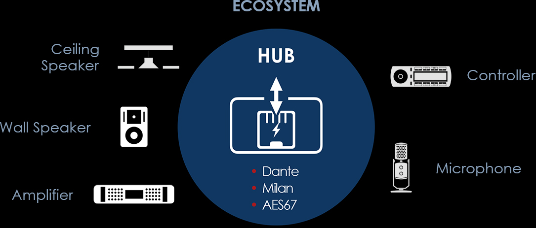 The speaker module is customizable by selecting MPE (Multiplet Platform Ethernet) modules with options from audio protocols like Dante, AES67, and Milan. The base system features onboard Flow DSP for sound enhancements and protection.